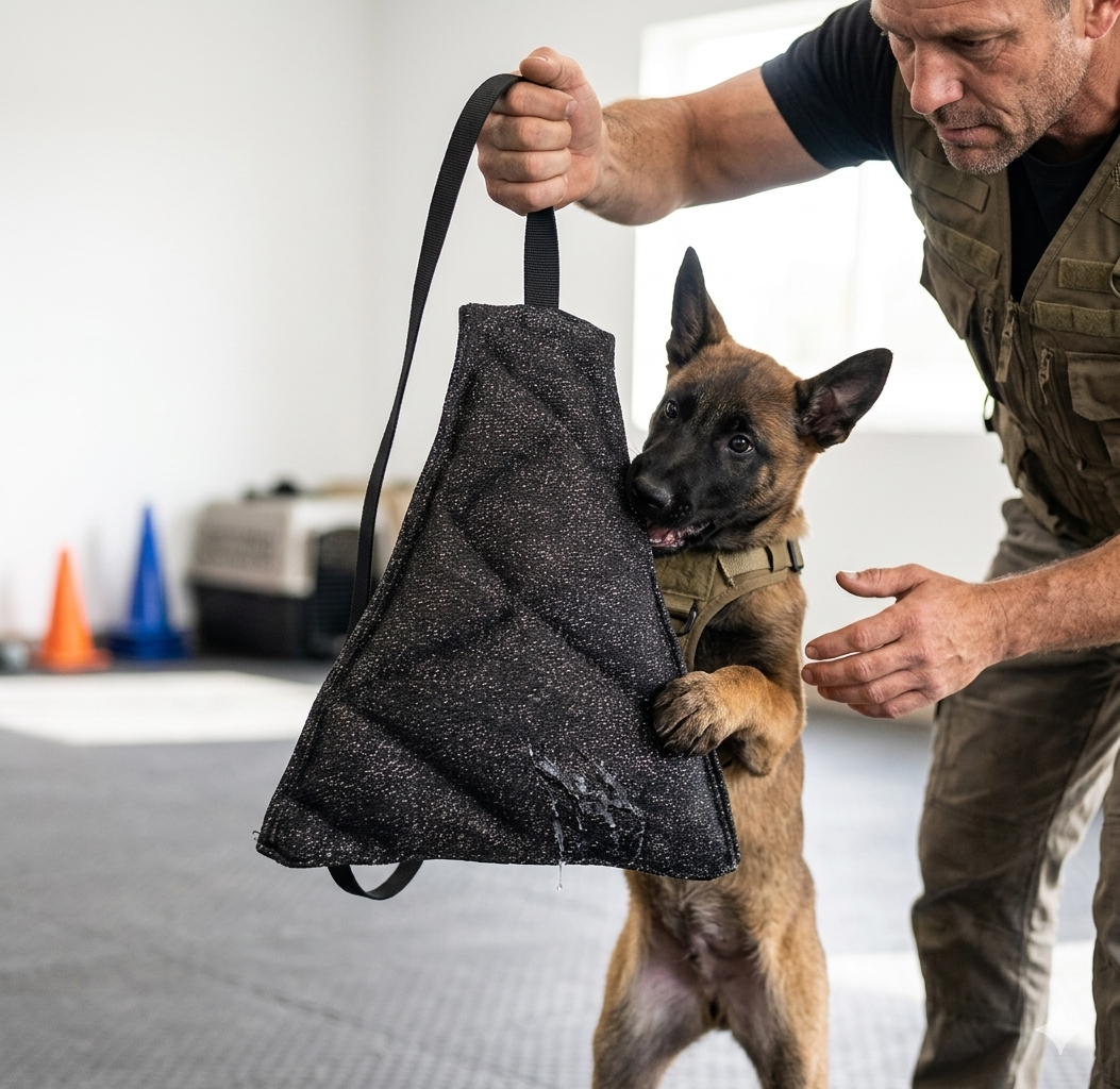 Não é um Brinquedo de Roer: Nunca deixe o travesseiro à disposição do animal sozinho. O tecido de bite suit é projetado para resistir à tração e pressão da mordida, mas não à mastigação persistente e focalizada.