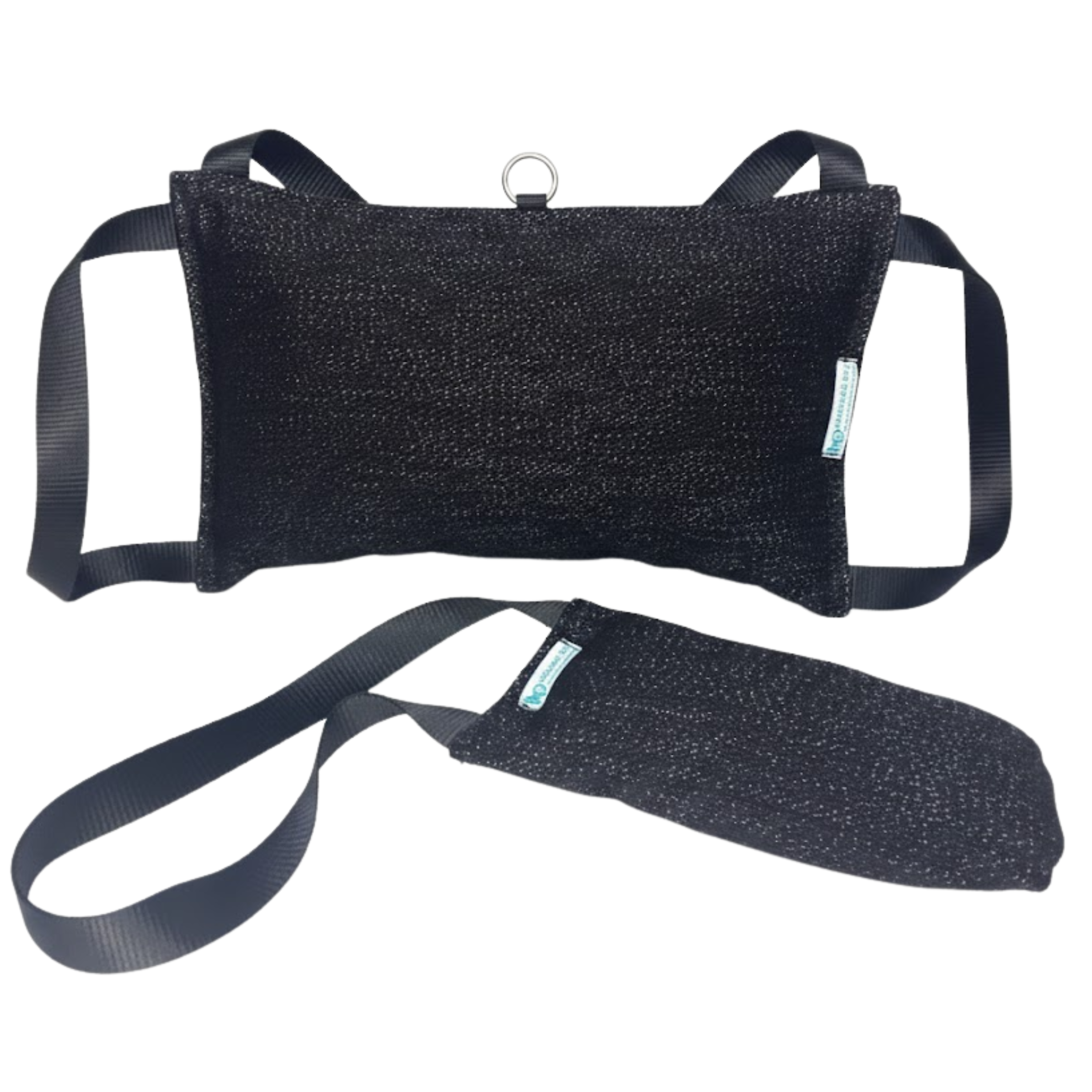 Travesseiro Bite Grande: Equipado com 3 alças laterais reforçadas e 1 argola central de metal. Isso permite uma pegada firme em diferentes ângulos, ideal para exercícios de proteção e tração.